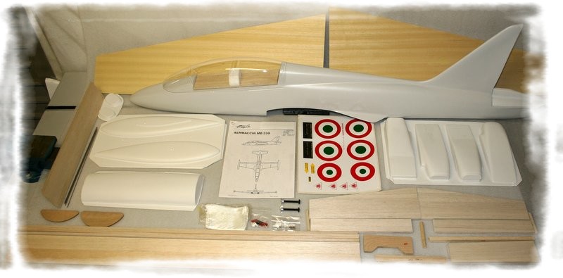 1. Full kit Aermacchi MB339 - £200.00 / 249 euro approx plus Post/Packing The fuselage, which incorporates the fin, is constructed from fibreglass, making a light and robust item, the wing root fairings front console and canopy rim are all moulded in saving the builder time. Wings are supplied in foam with obechi skinning, tip tanks, nacelles, canopy and a decal set, cockpit instrument template sheet are all supplied, also along with accessories (rods, horns etc.) plus pre-cut wood.